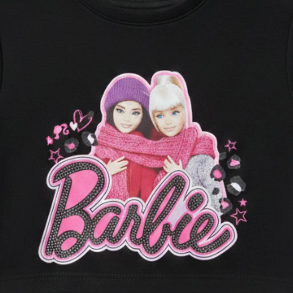 This black Barbie crop top is the perfect mix of edgy and cute. Featuring a striking pink Barbie graphic with character artwork, it stands out beautifully against the deep black base—making it a must-have for girls who love trendy statement pieces.