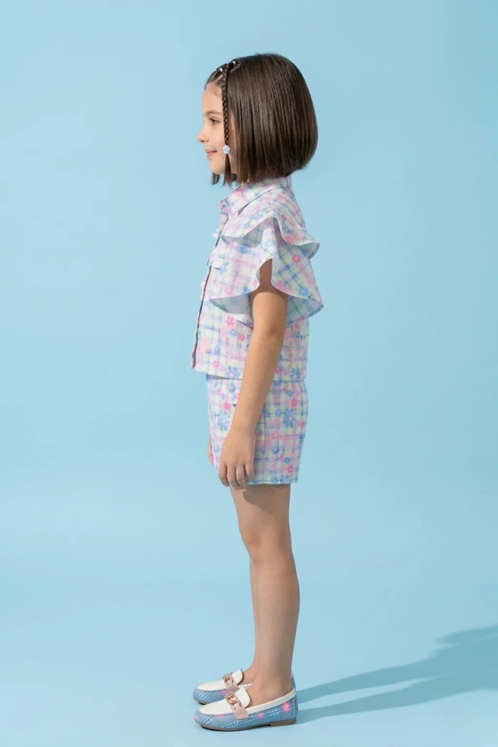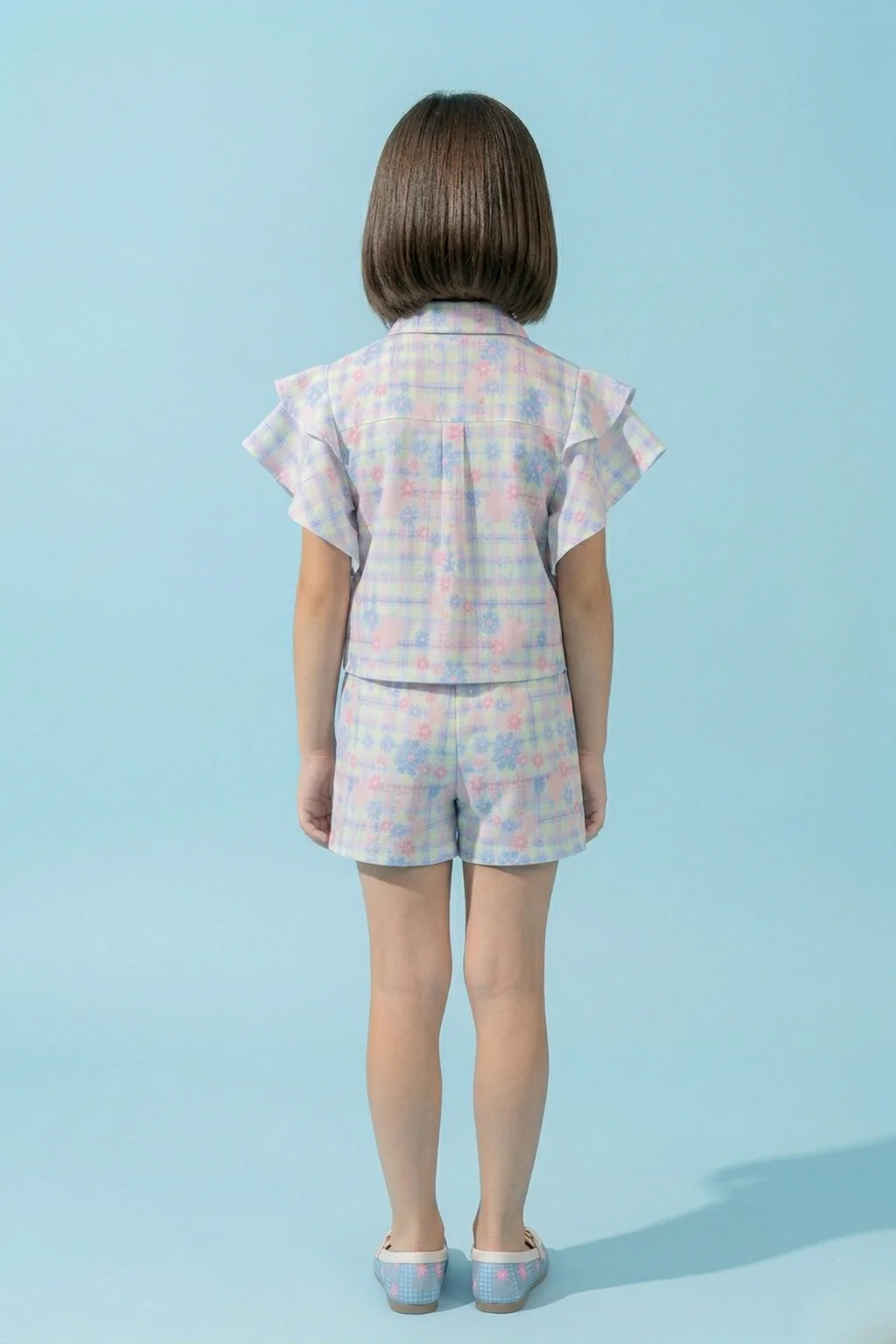 The ruffle sleeve top adds soft volume and charm, while the coordinated shorts offer ease of movement and a relaxed fit—perfect for warm days, outings, or special moments. The delicate pastel floral check print gives this girls summer outfit a dreamy, elevated feel.